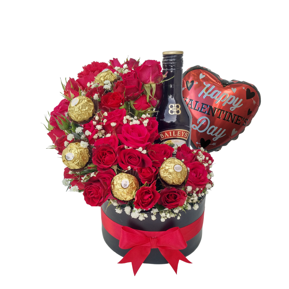 CS7 – mini roses with baby breath & Ferrero Rocher plus Baileys 200ml vday