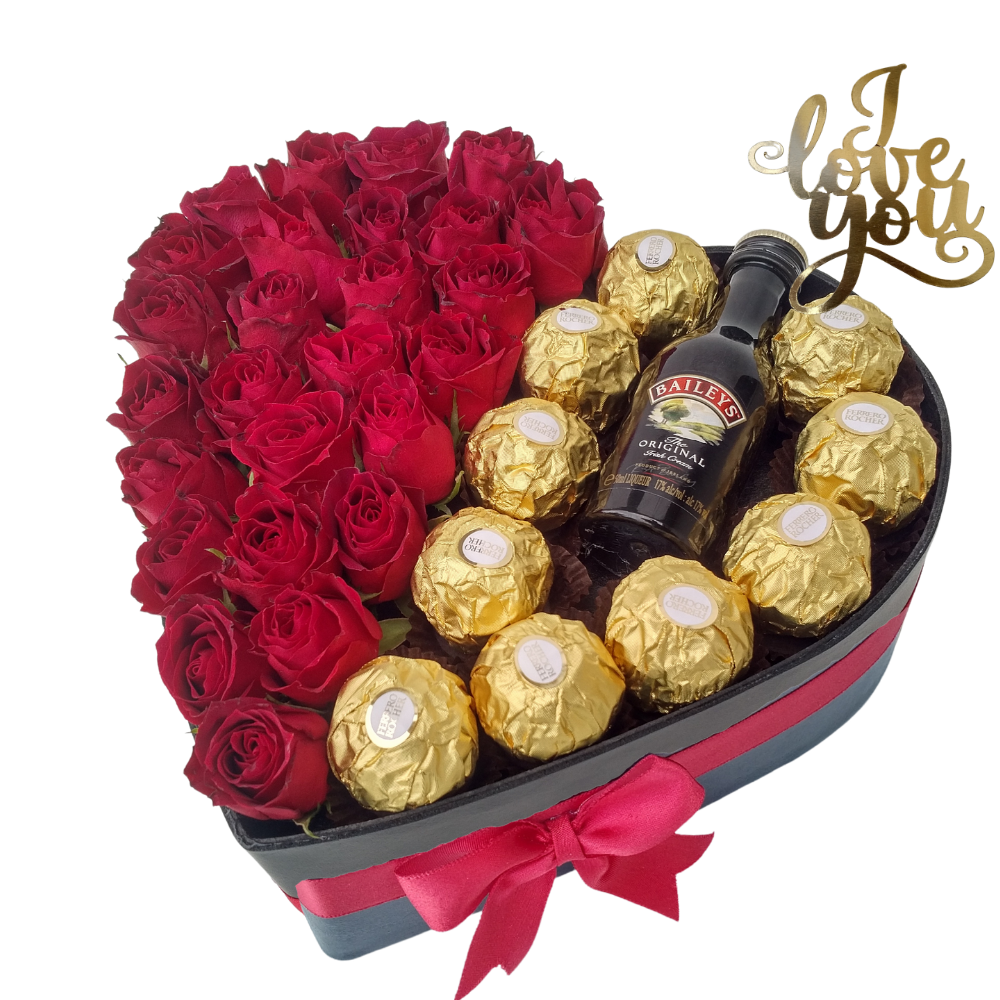 H20 – mini roses & Ferrero Rocher heart box with mini Baileys vday
