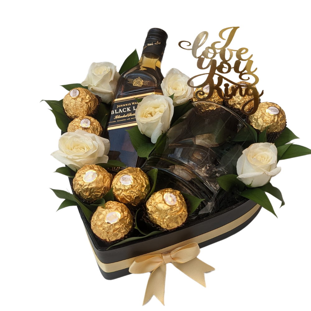 HM13 – mini roses with black label 200ml Ferrero Rocher & whisky glass vday